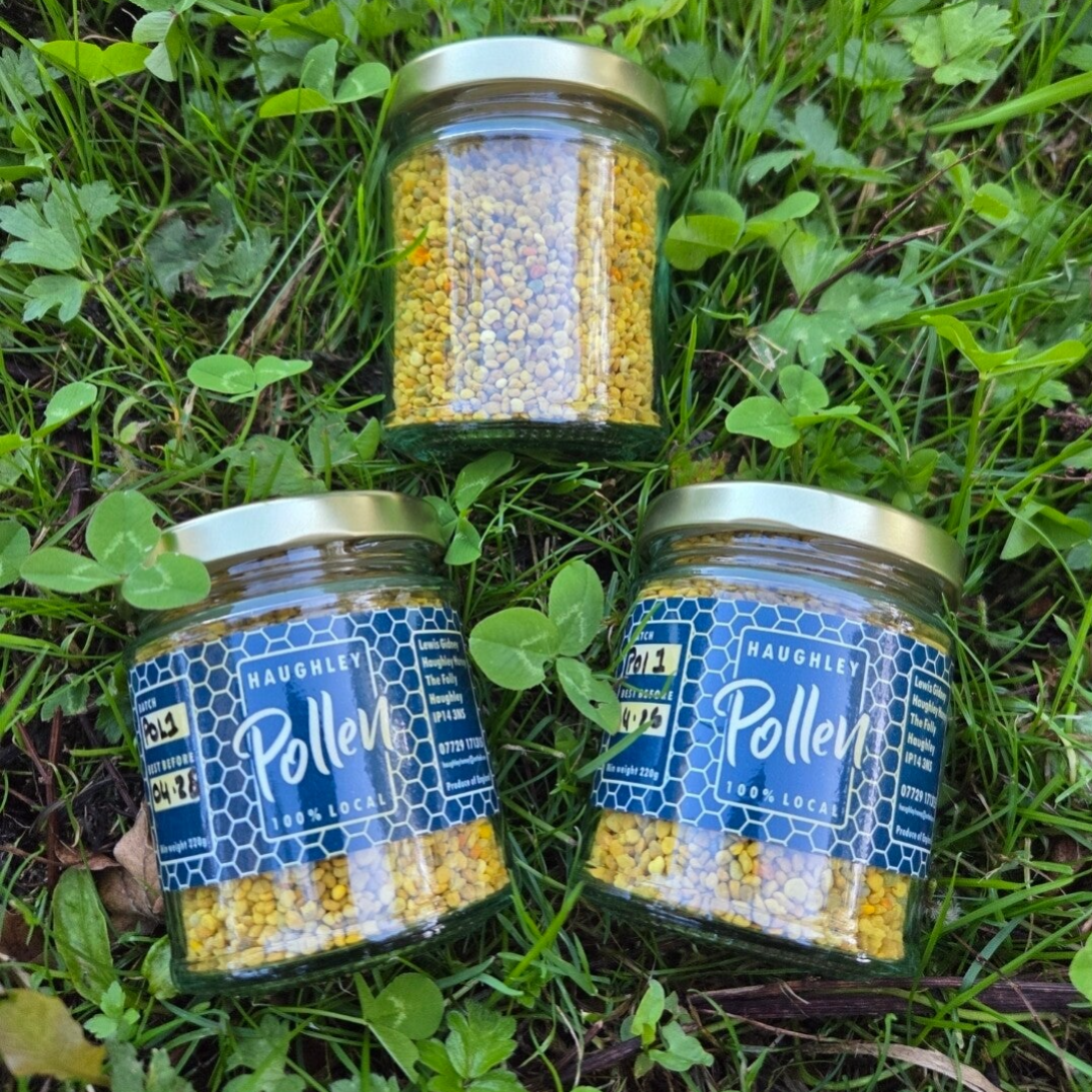 We collect the pollen using a trap that fits onto the entrance of the hive and knocks pollen from the bees legs as they pass through. These are only added on warm days and to the very strongest colonies for short amounts of time during a pollen flow, so we do not damage or disturb a colony.